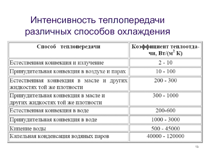 Слайд 13Интенсивность теплопередачи различных способов охлаждения