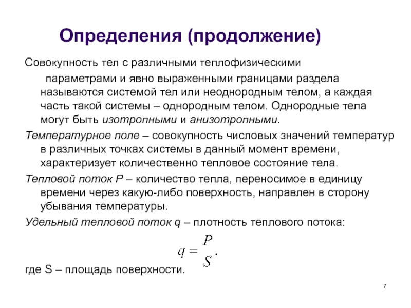 Тепловой поток Р – количество тепла, переносимое в единицу времени через какую-либо поверхность, направлен в сторону убывания температуры.