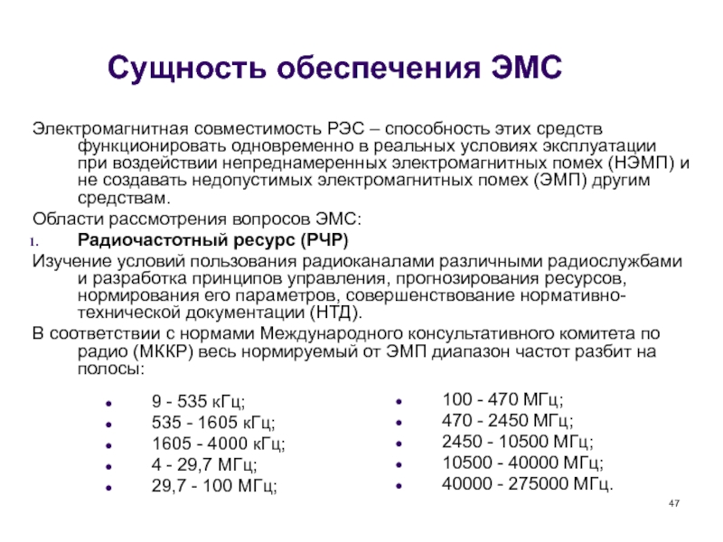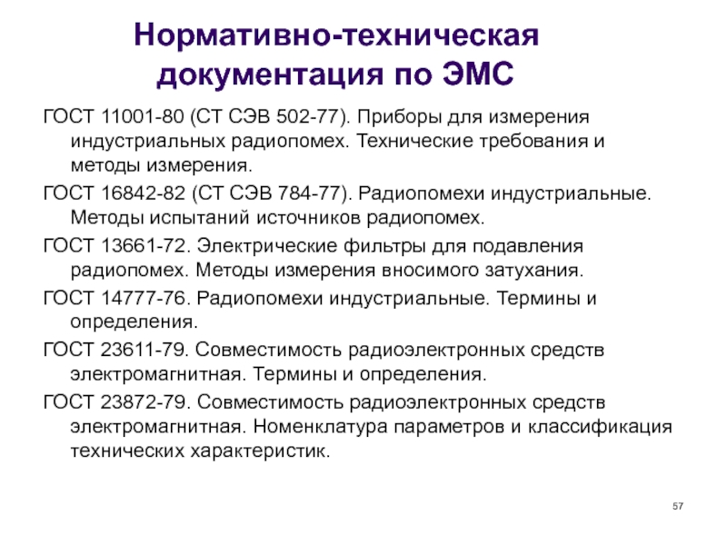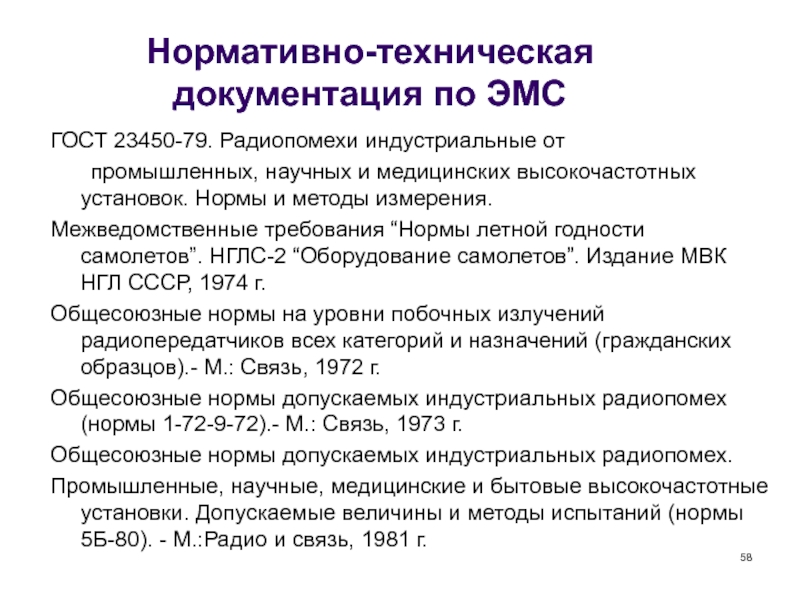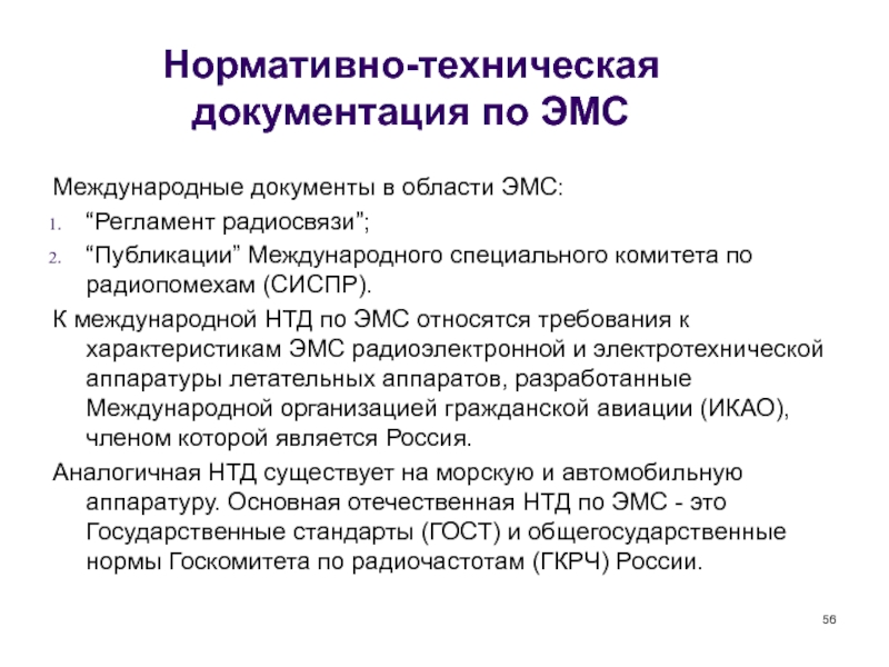 Аналогичная НТД существует на морскую и автомобильную аппаратуру. Основная отечественная НТД по ЭМС - это Государственные стандарты (ГОСТ) и общегосударственные нормы Госкомитета по радиочастотам (ГКРЧ) России.