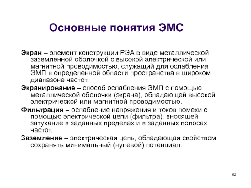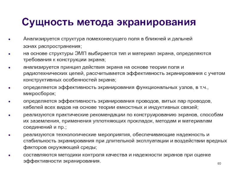 анализируется принцип действия экрана на основе теории поля и радиотехнических цепей, рассчитывается эффективность экранирования с учетом конструктивных особенностей экрана;