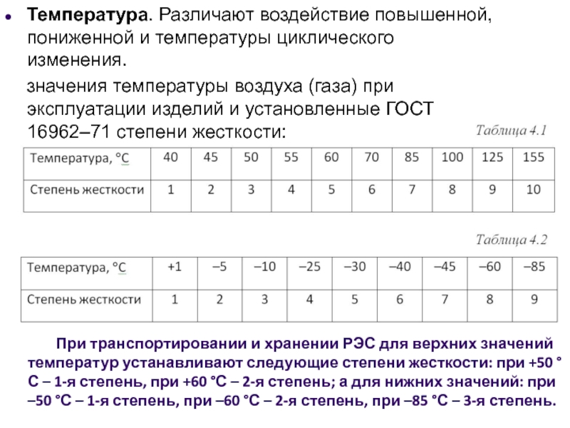 Слайд 2Температура. Различают воздействие повышенной, пониженной и температуры циклического изменения.