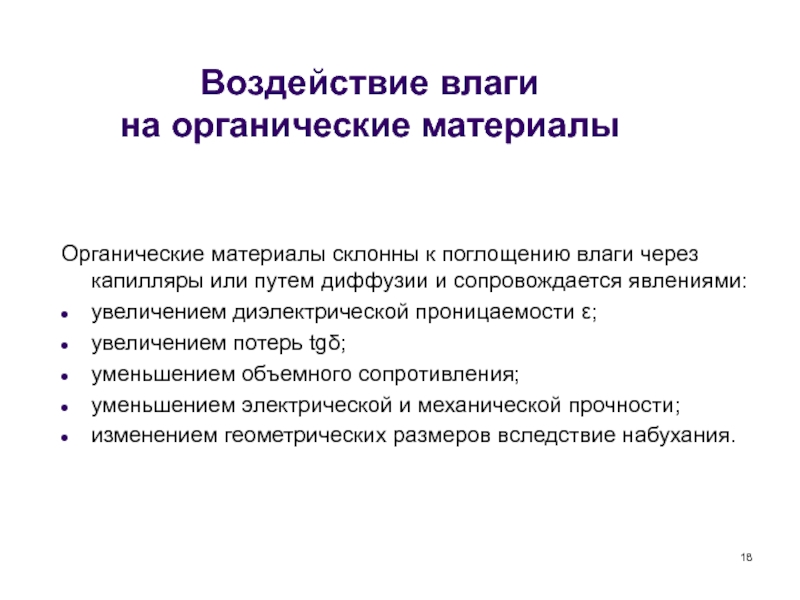 У диэлектриков уменьшается сопротивление и пробивное напряжение, возрастает tgδ и уменьшается диэлектрическая проницаемость.