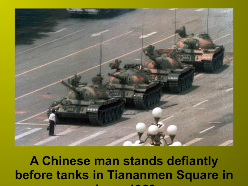 Слайд 13A Chinese man stands defiantly before tanks in Tiananmen Square