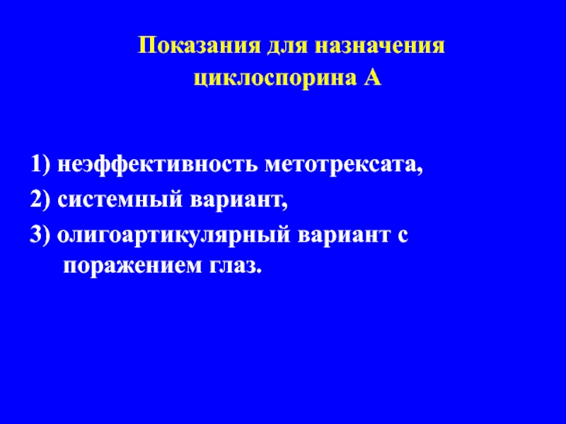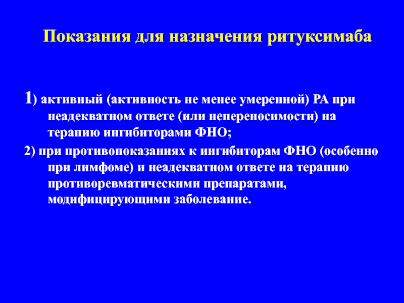 при противопоказаниях к ингибиторам ФНО (особенно при лимфоме) и неадекватном ответе на терапию противоревматическими препаратами, модифицирующими заболевание.