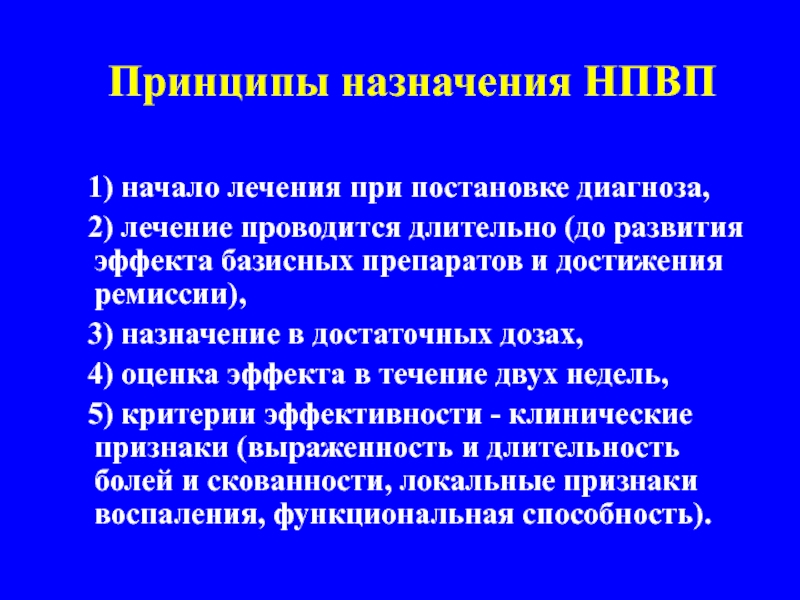 5) критерии эффективности - клинические признаки (выраженность и длительность болей и скованности, локальные признаки воспаления, функциональная способность).