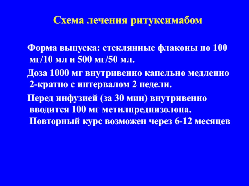 Перед инфузией (за 30 мин) внутривенно вводится 100 мг метилпреднизолона. Повторный курс возможен через 6-12 месяцев