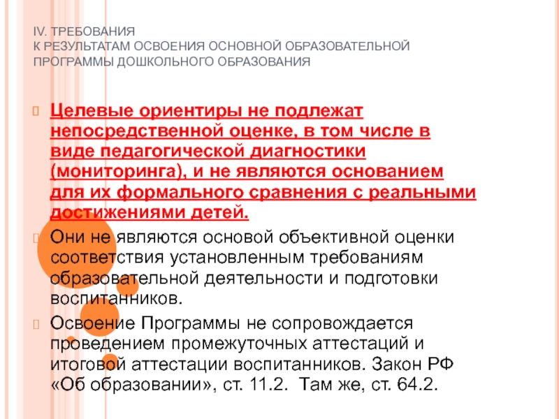 Освоение Программы не сопровождается проведением промежуточных аттестаций и итоговой аттестации воспитанников. Закон РФ «Об образовании», ст. 11.2. Там же, ст. 64.2.