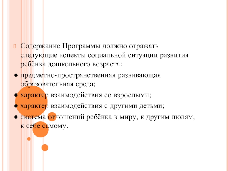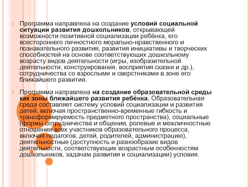 Программа направлена на создание образовательной среды как зоны ближайшего развития ребёнка. Образовательная среда составляет систему условий социализации и развития детей, включая пространственно-временные гибкость и трансформируемость предметного пространства), социальные (формы сотрудничества и общения, ролевые и межличностные отношения всех участников образовательного процесса, включая педагогов, детей, родителей, администрацию), деятельностные (доступность и разнообразие видов деятельности, соответствующих возрастным особенностям дошкольников, задачам развития и социализации) условия.