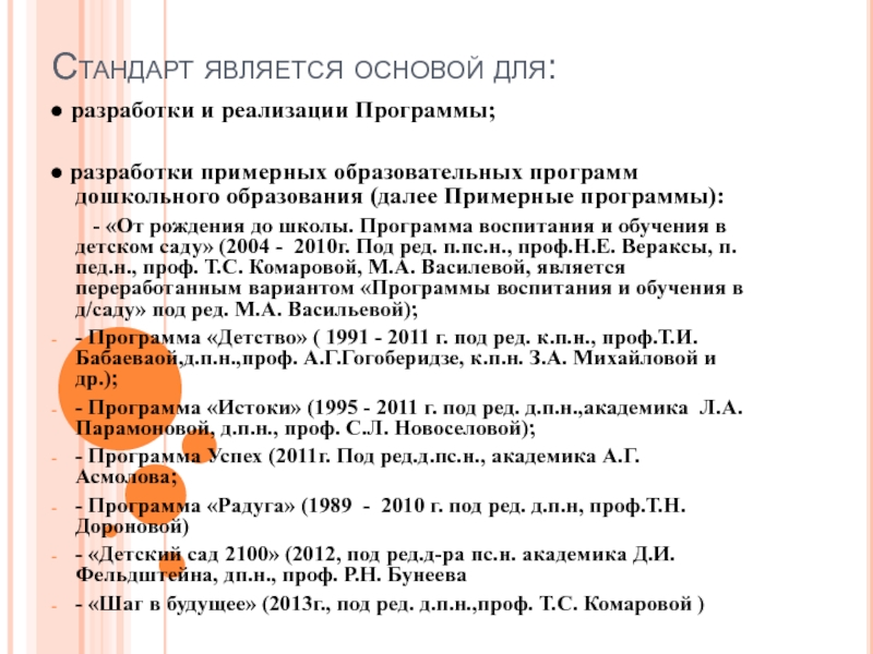 - Программа «Детство» ( 1991 - 2011 г. под ред. к.п.н., проф.Т.И. Бабаеваой,д.п.н.,проф. А.Г.Гогоберидзе, к.п.н. З.А. Михайловой и др.);