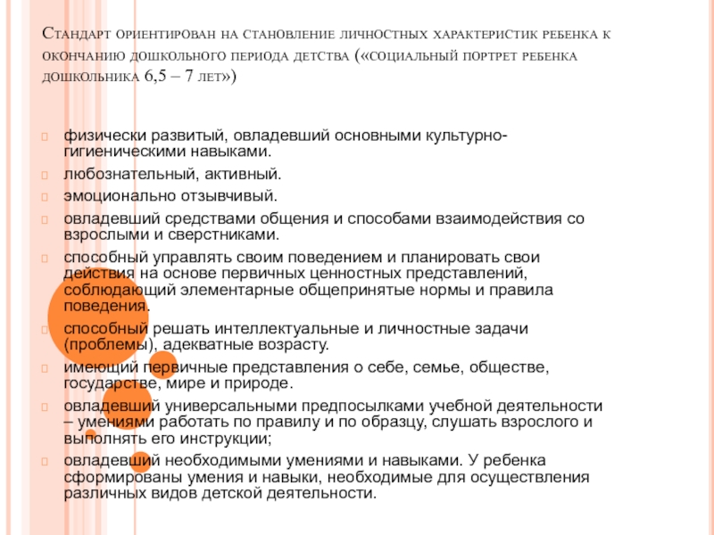 Слайд 27Стандарт ориентирован на становление личностных характеристик ребенка к окончанию дошкольного