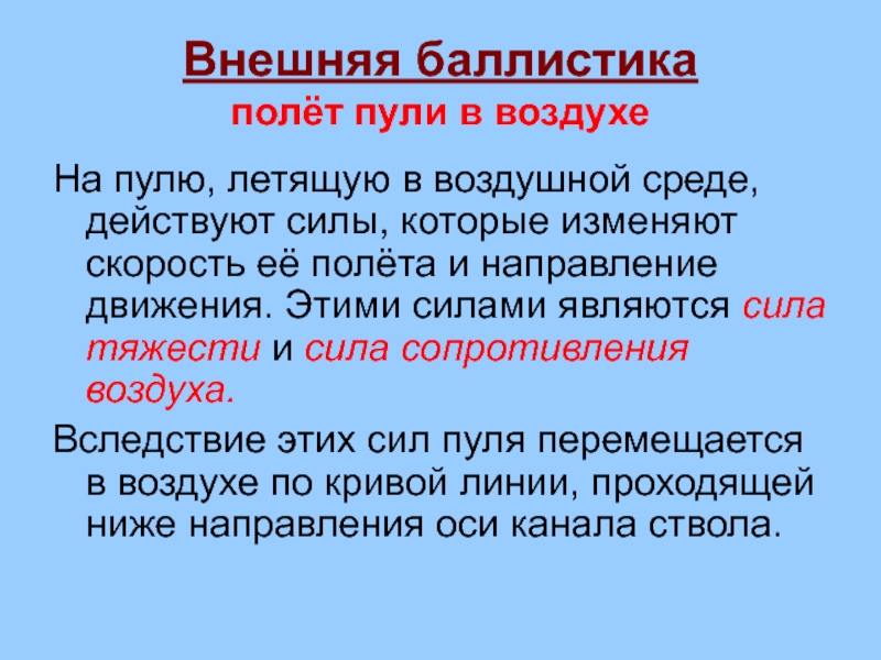 Вследствие этих сил пуля перемещается в воздухе по кривой линии, проходящей ниже направления оси канала ствола.