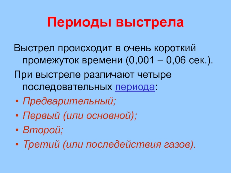 Второй период длится от момента полного сгорания порохового заряда до момента вылета пули из канала ствола;