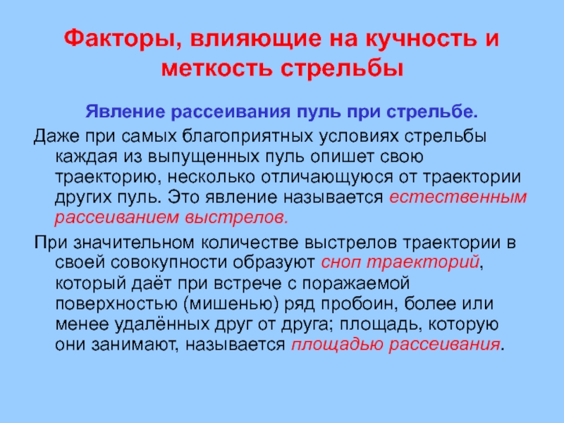 опишет свою траекторию, несколько отличающуюся от траектории других пуль. Это явление называется естественным рассеиванием выстрелов.
