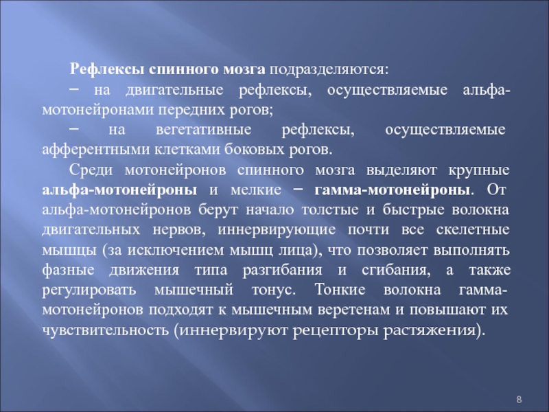 мотонейронов спинного мозга выделяют крупные альфа-мотонейроны и мелкие – гамма-мотонейроны. От альфа-мотонейронов берут начало толстые и быстрые волокна двигательных нервов, иннервирующие почти все скелетные мышцы (за исключением мышц лица), что позволяет выполнять фазные движения типа разгибания и сгибания, а также регулировать мышечный тонус. Тонкие волокна гамма-мотонейронов подходят к мышечным веретенам и повышают их чувствительность (иннервируют рецепторы растяжения).