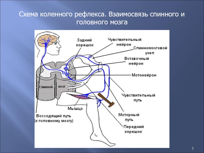 Слайд 5Схема коленного рефлекса. Взаимосвязь спинного и головного мозга
