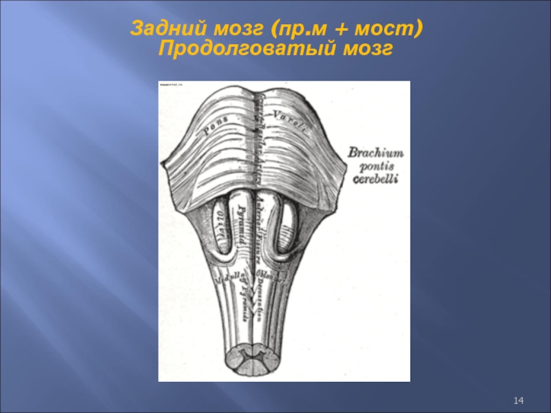 Слайд 14Задний мозг (пр.м + мост)