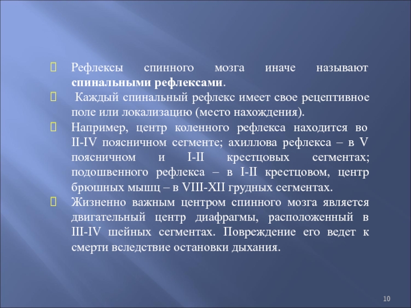 коленного рефлекса находится во II-IV поясничном сегменте; ахиллова рефлекса – в V поясничном и I-II крестцовых сегментах; подошвенного рефлекса – в I-II крестцовом, центр брюшных мышц – в VIII-XII грудных сегментах.