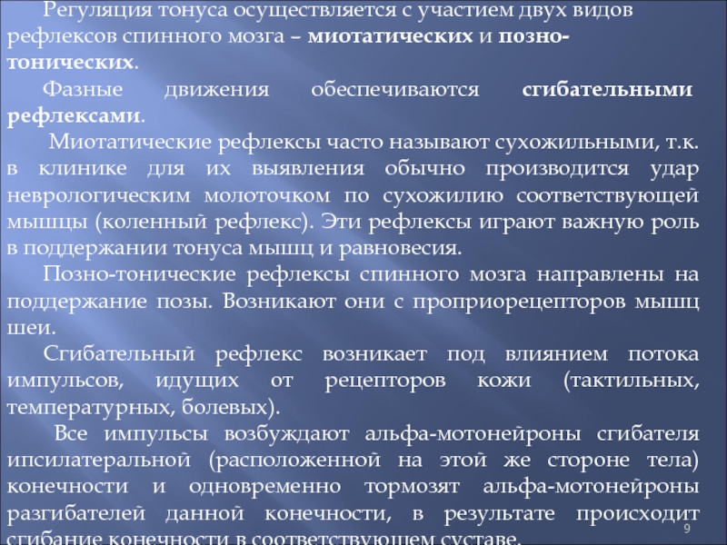 Слайд 9Регуляция тонуса осуществляется с участием двух видов рефлексов спинного мозга
