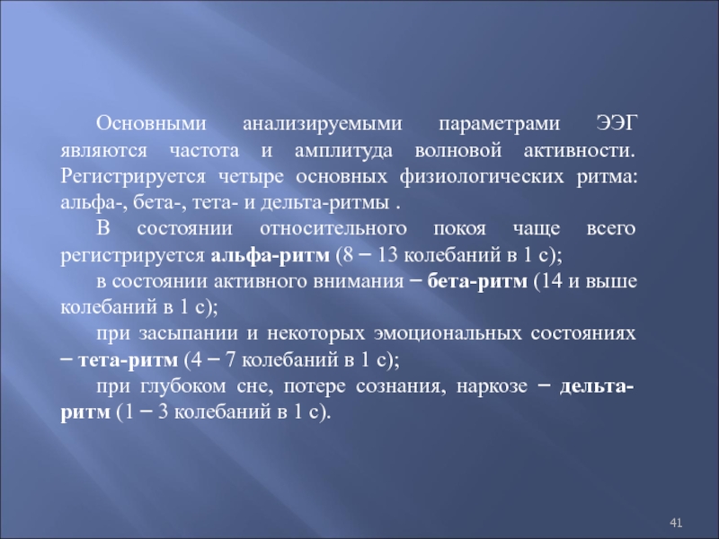 Слайд 41Основными анализируемыми параметрами ЭЭГ являются частота и амплитуда волновой активности.