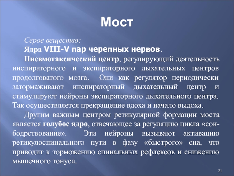 Другим важным центром ретикулярной формации моста является голубое ядро, отвечающее за регуляцию цикла «сон-бодрствование». Эти нейроны вызывают активацию ретикулоспинального пути в фазу «быстрого» сна, что приводит к торможению спинальных рефлексов и снижению мышечного тонуса.