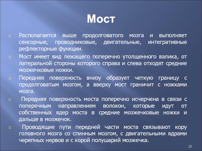 бокам которой располагаются пирамиды. Пирамиды образованы пучками нервных волокон пирамидных проводящих путей. Волокна пирамидных путей соединяют кору большого мозга с ядрами черепных нервов и серым веществом спинного мозга. Сбоку от пирамиды с каждой стороны располагается олива.