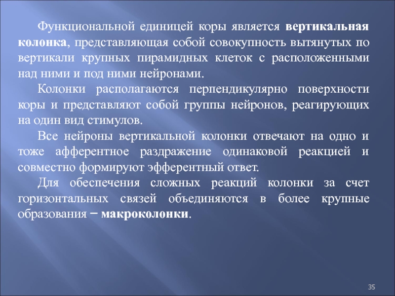 Слайд 35Функциональной единицей коры является вертикальная колонка, представляющая собой совокупность вытянутых
