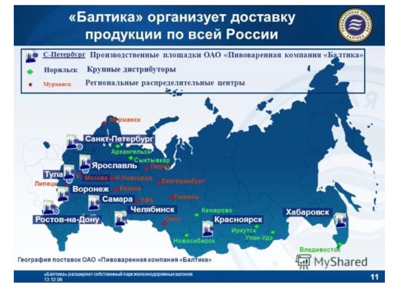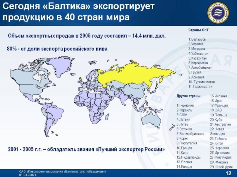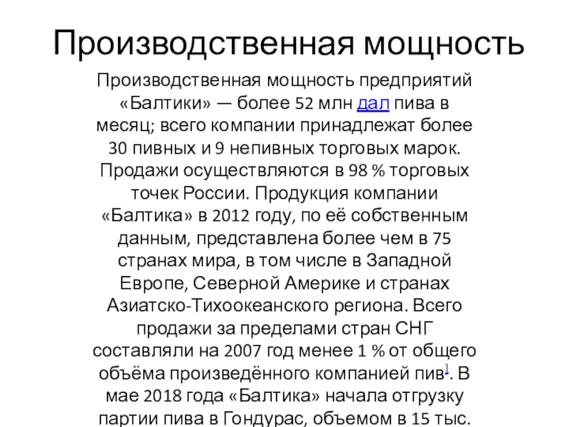 торговых марок. Продажи осуществляются в 98 % торговых точек России. Продукция компании «Балтика» в 2012 году, по её собственным данным, представлена более чем в 75 странах мира, в том числе в Западной Европе, Северной Америке и странах Азиатско-Тихоокеанского региона. Всего продажи за пределами стран СНГ составляли на 2007 год менее 1 % от общего объёма произведённого компанией пив]. В мае 2018 года «Балтика» начала отгрузку партии пива в Гондурас, объемом в 15 тыс. литров.