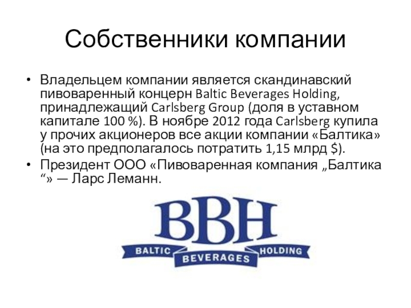 Владельцем компании является скандинавский пивоваренный концерн Baltic Beverages Holding,