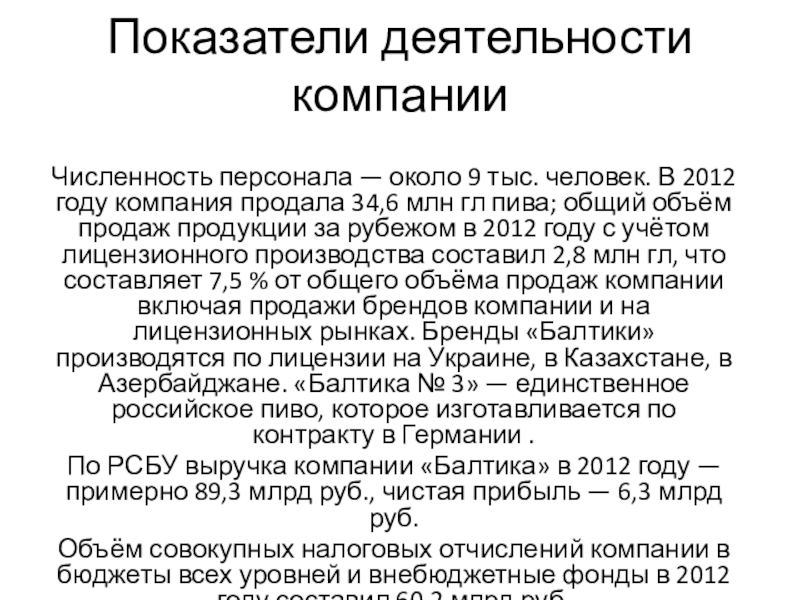 По РСБУ выручка компании «Балтика» в 2012 году — примерно 89,3 млрд руб., чистая прибыль — 6,3 млрд руб.