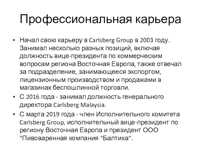 Начал свою карьеру в Carlsberg Group в 2003 году.