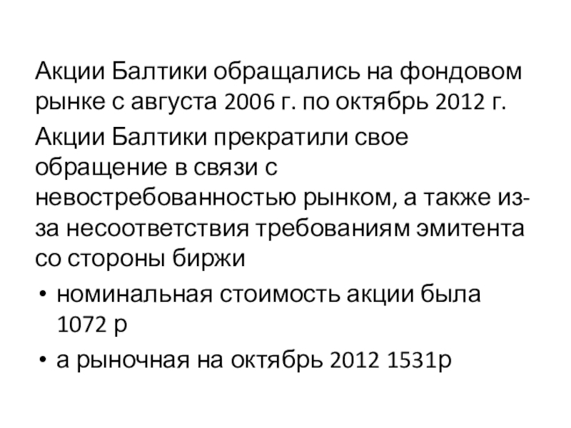 Слайд 9Акции Балтики обращались на фондовом рынке с августа 2006 г.