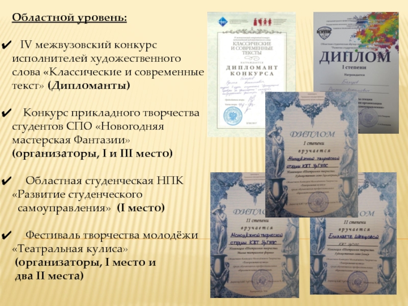 Областной уровень:  IV межвузовский конкурс исполнителей художественного слова «Классические и современные текст» (Дипломанты)  Конкурс прикладного