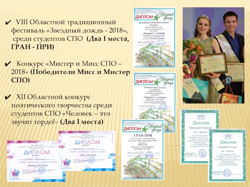 VIII Областной традиционный фестиваль «Звездный дождь - 2018»,   среди студентов СПО (Два I