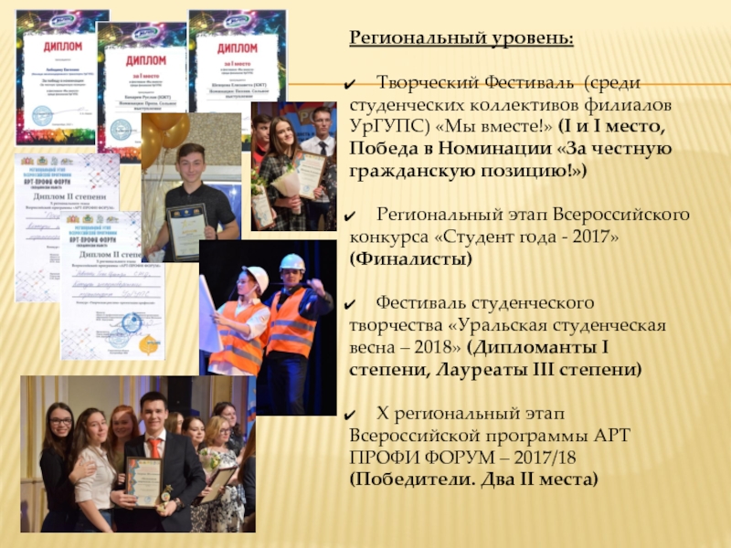 Региональный уровень:Творческий Фестиваль (средистуденческих коллективов филиаловУрГУПС) «Мы вместе!» (I и I место,Победа в Номинации «За честнуюгражданскую позицию!»)Региональный