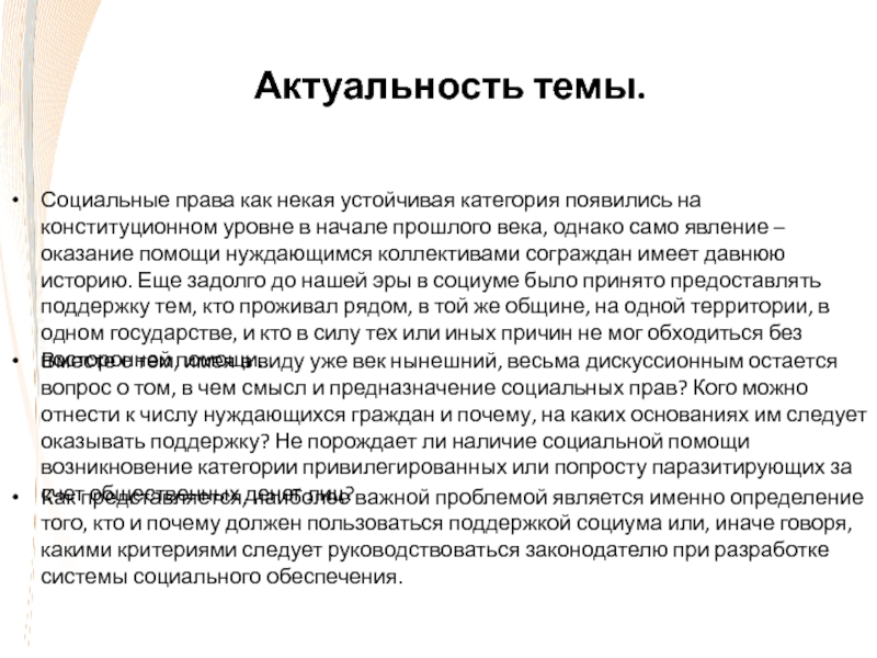 Вместе с тем, имея в виду уже век нынешний, весьма дискуссионным остается вопрос о том, в чем смысл и предназначение социальных прав? Кого можно отнести к числу нуждающихся граждан и почему, на каких основаниях им следует оказывать поддержку? Не порождает ли наличие социальной помощи возникновение категории привилегированных или попросту паразитирующих за счет общественных денег лиц?