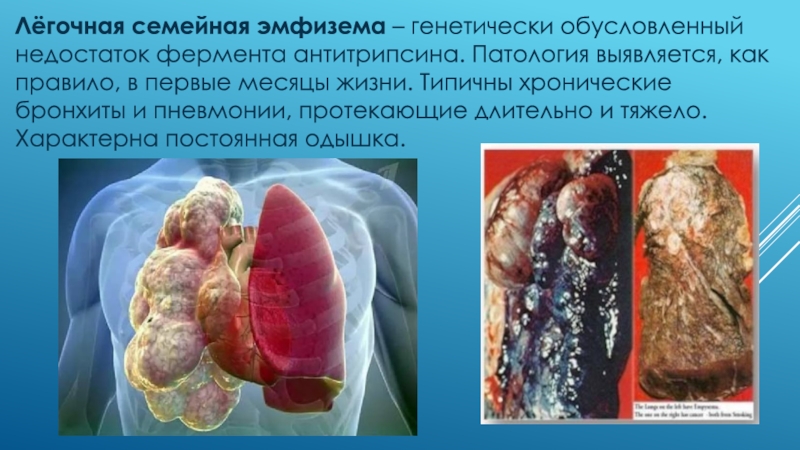 Лёгочная семейная эмфизема – генетически обусловленный недостаток фермента антитрипсина.