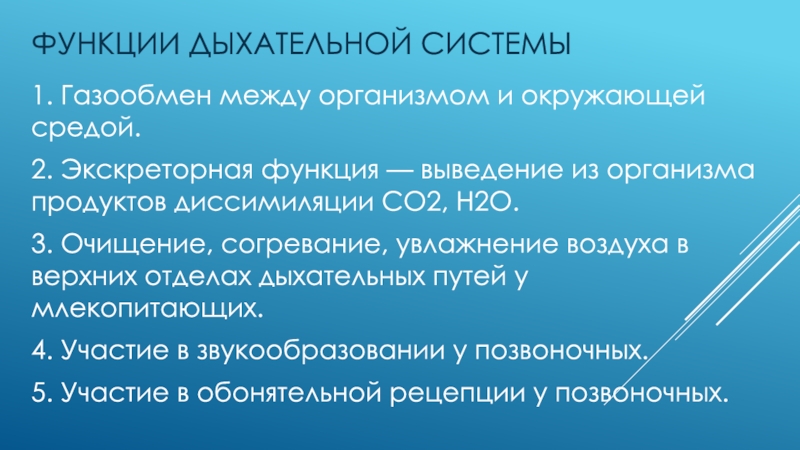 Экскреторная функция — выведение из организма продуктов диссимиляции СО2, Н2О.
