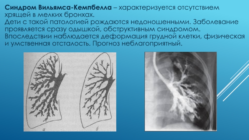 Синдром Вильямса-Кемпбелла – характеризуется отсутствием хрящей в мелких бронхах.