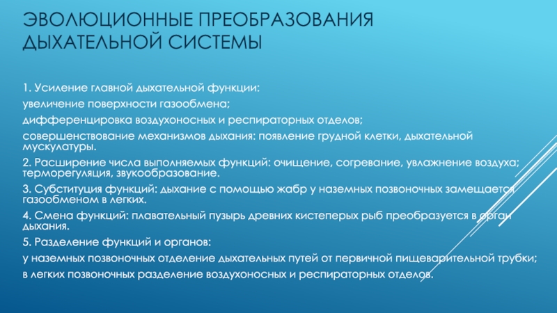 3. Субституция функций: дыхание с помощью жабр у наземных позвоночных замещается газообменом в легких.