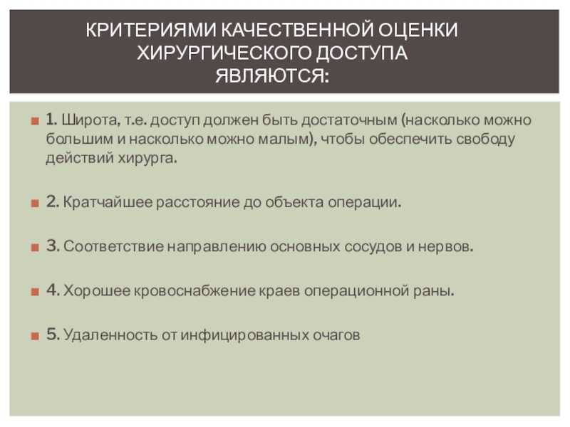 Критериями качественной оценки хирургического доступа являются: