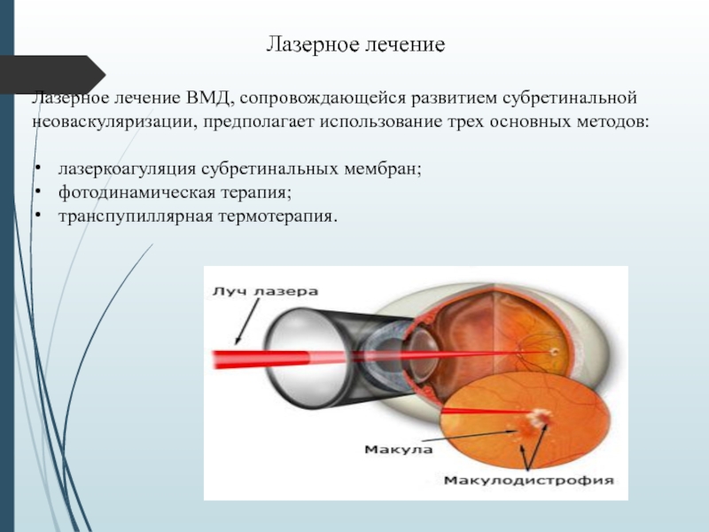 Лазерное лечение ВМД, сопровождающейся развитием субретинальной неоваскуляризации, предполагает использование