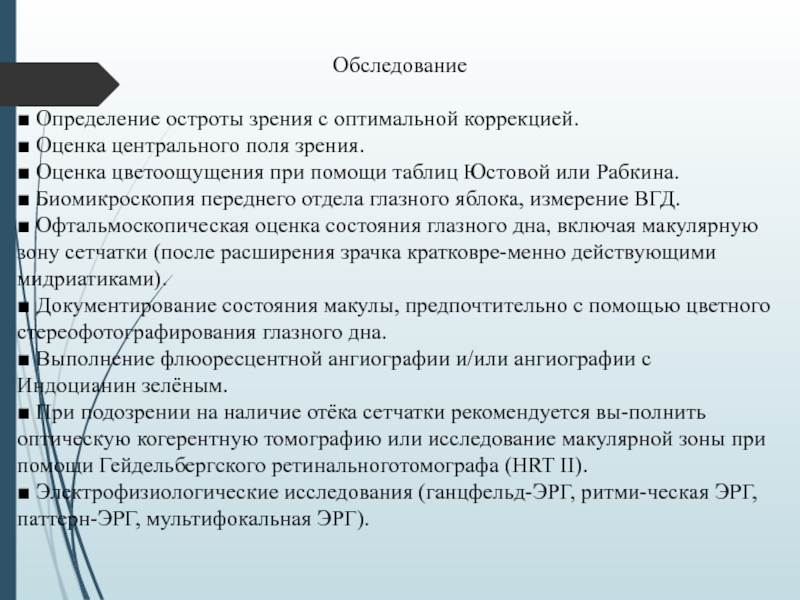 ■ При подозрении на наличие отёка сетчатки рекомендуется вы-полнить оптическую когерентную томографию или исследование макулярной зоны при помощи Гейдельбергского ретинальноготомографа (HRT II).
