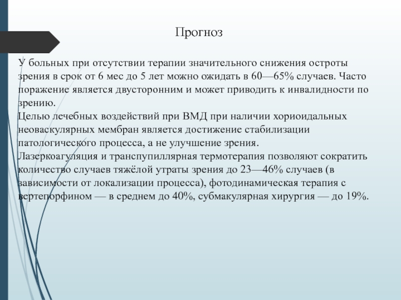 -Лечение сухой формы ВМД на данный момент не разработано, хотя было продемонстрировано, что применение некоторых пищевых добавок замедляет прогрессирование у лиц с самым высоким риском.