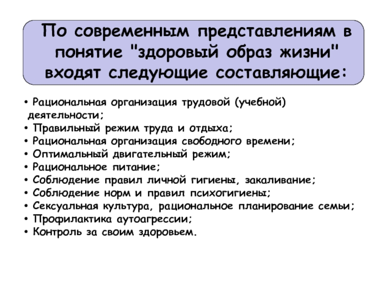 Слайд 7По современным представлениям в понятие "здоровый образ жизни" входят следующие