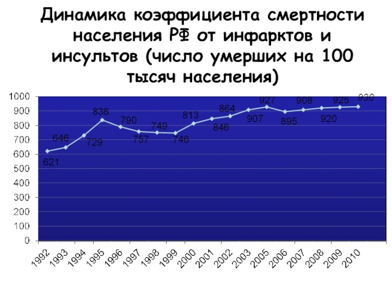 Слайд 48Динамика коэффициента смертности населения РФ от инфарктов и инсультов (число