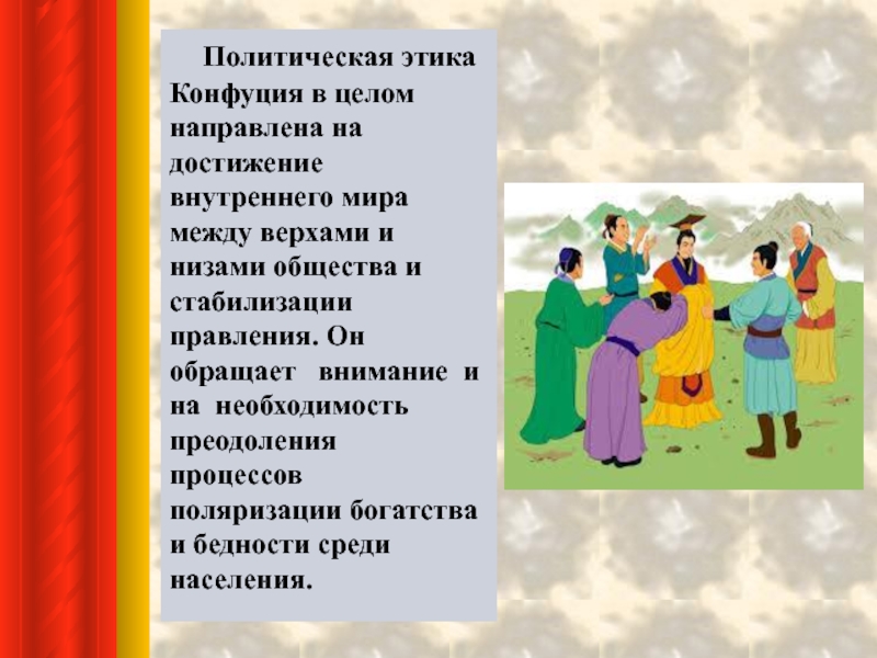 Слайд 9 Политическая этика Конфуция в целом направлена на достижение