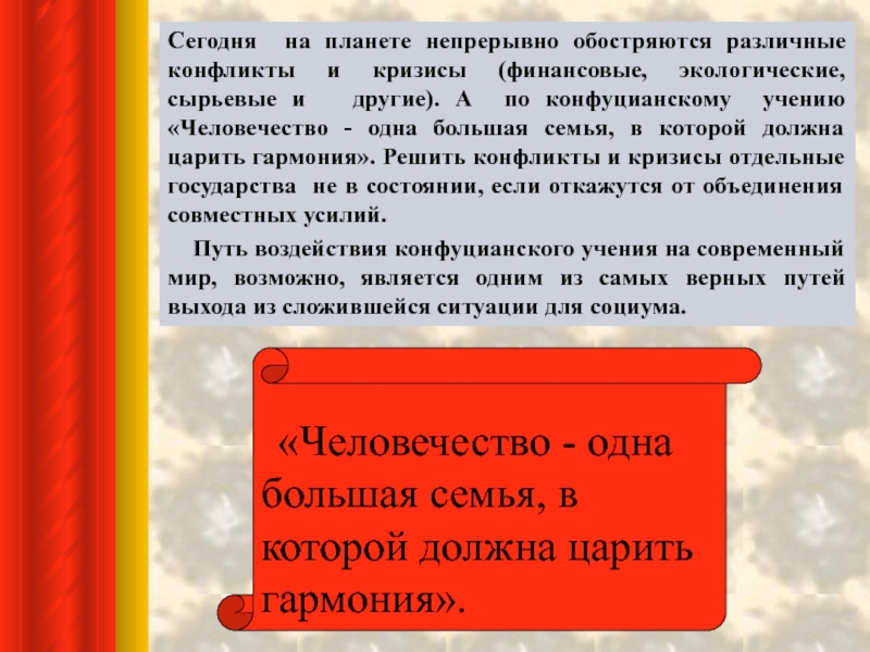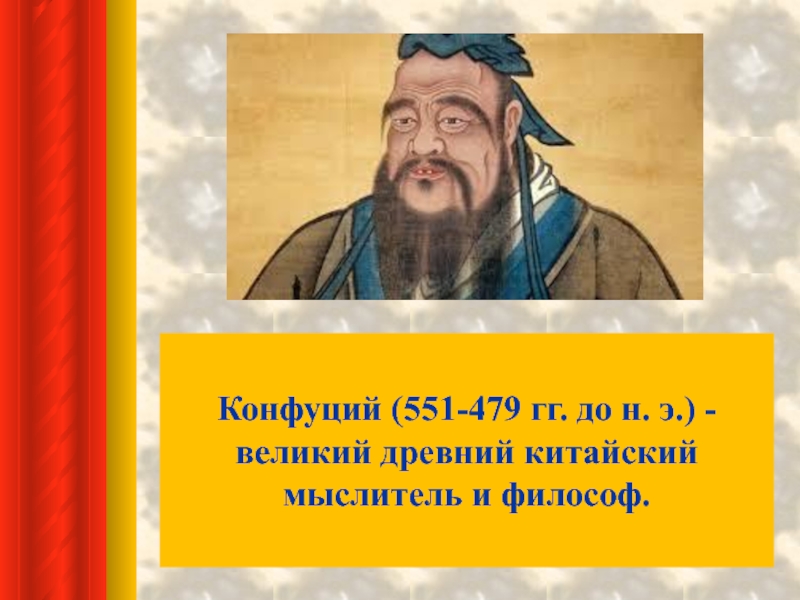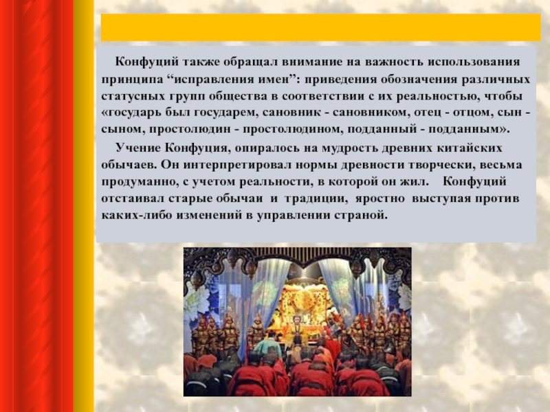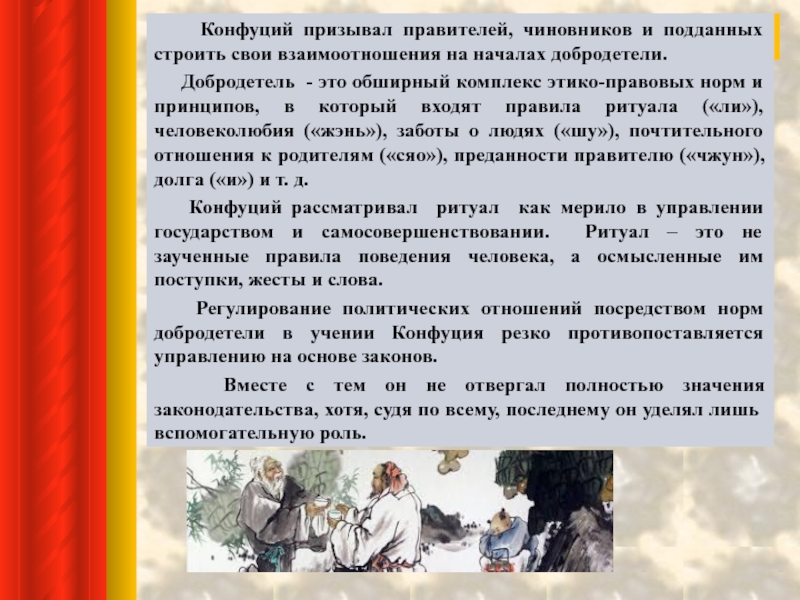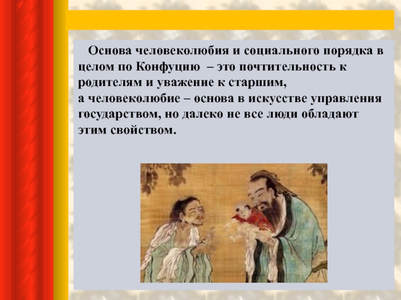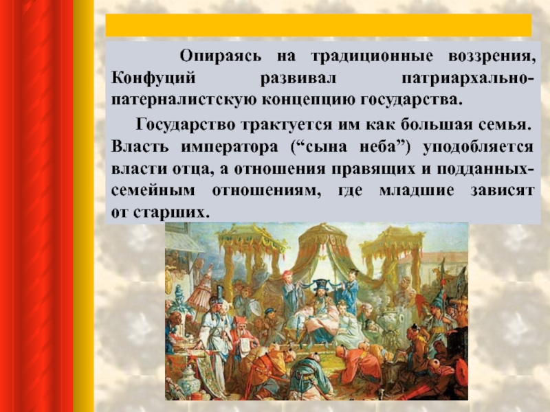 Слайд 6 Опираясь на традиционные воззрения, Конфуций развивал патриархально-патерналистскую