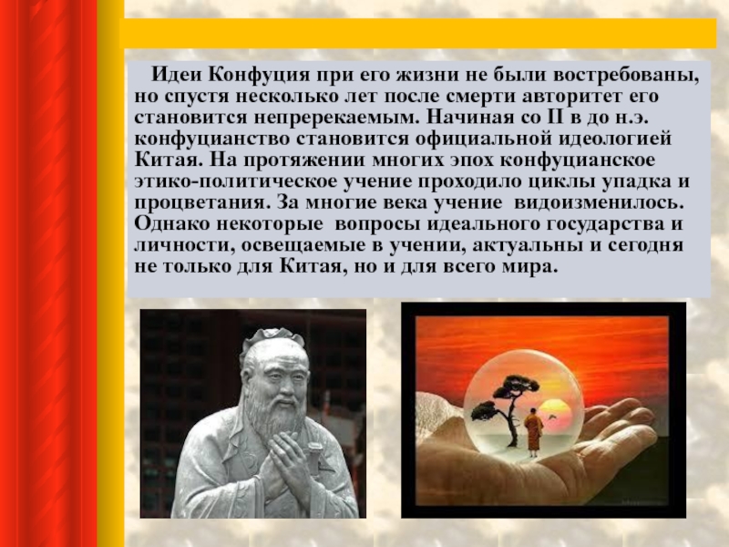 непререкаемым. Начиная со II в до н.э. конфуцианство становится официальной идеологией Китая. На протяжении многих эпох конфуцианское этико-политическое учение проходило циклы упадка и процветания. За многие века учение видоизменилось. Однако некоторые вопросы идеального государства и личности, освещаемые в учении, актуальны и сегодня не только для Китая, но и для всего мира.