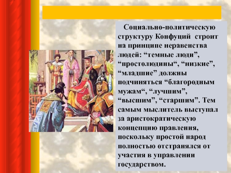 Слайд 7 Социально-политическую структуру Конфуций строит на принципе неравенства людей: