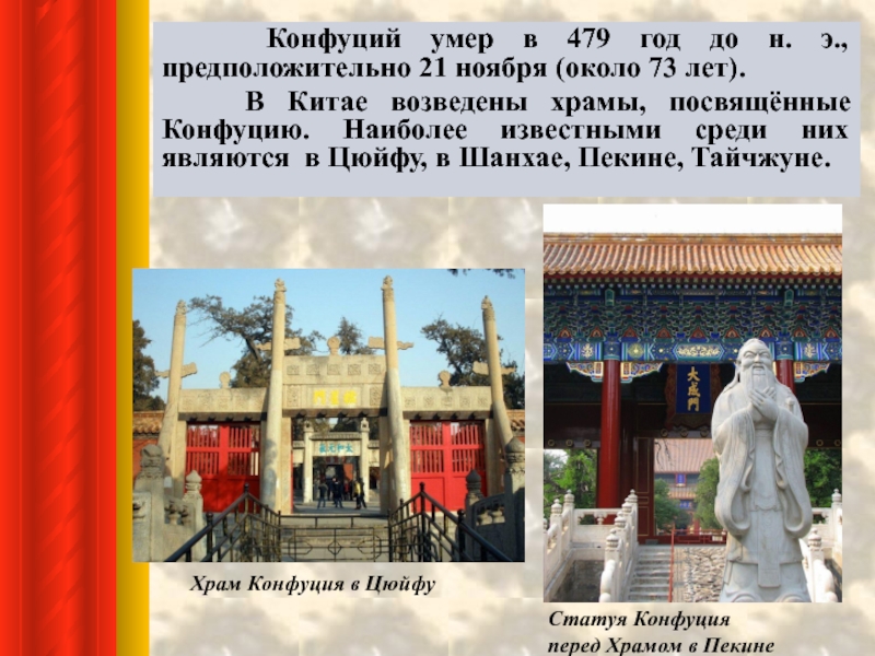 Китае возведены храмы, посвящённые Конфуцию. Наиболее известными среди них являются в Цюйфу, в Шанхае, Пекине, Тайчжуне.